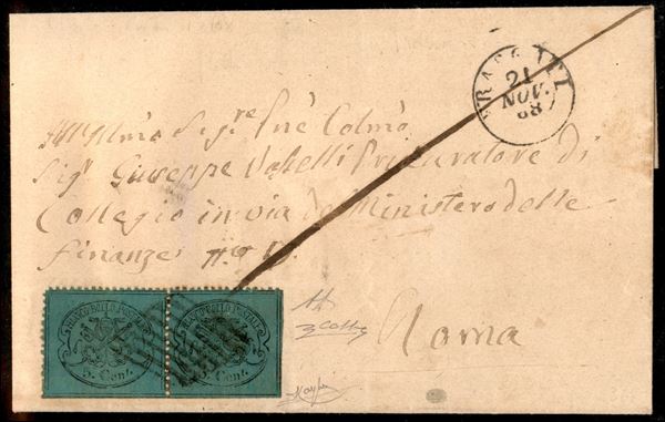 5 cent (25b - pos. 119/120) - coppia angolare con doppi filetti completi (8 nel pezzo di sinistra) - lettera da Frascati a Roma del 21.11.1868 - A. Diena + M. Raybaudi + cert. G. Colla