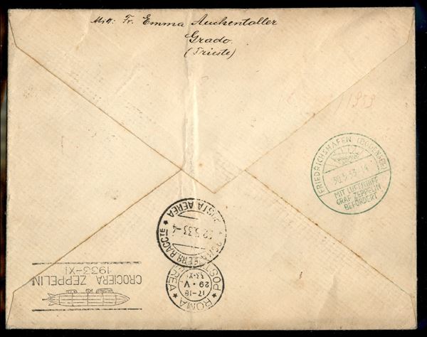 Aerogramma raccomandato con la serie completa della Crociera Zeppelin (45/50) + 2,75 lire Decennale (339) da Grado a Eupen (Belgio) del 20.5.33 - qualche ingiallimento diffuso