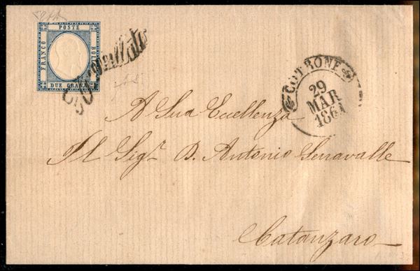 Annullato di Cotrone - 2 grana (20) corto in alto su lettera per Catanzaro del 29.3.1861 - A. Diena + A. Fiecchi + En. Diena