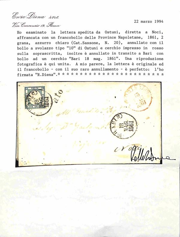 Annullato di Ostuni (rosso) + Bari annullatore (ripetuto a lato) - 2 grana (20) su lettera per Noci del 18.5.1861 - cert. R. Diena