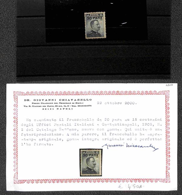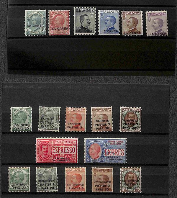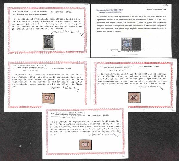 AREA ITALIANA - 1908/1926 - Piccolo insieme di esemplari nuovi del periodo di Regno d'Italia e Uffici Postali all'Estero montati su 5 cartoncini - diversi certificati - valore di catalogo oltre 18000 € - merita esame