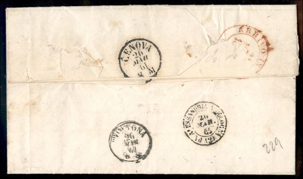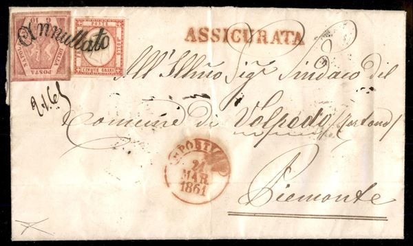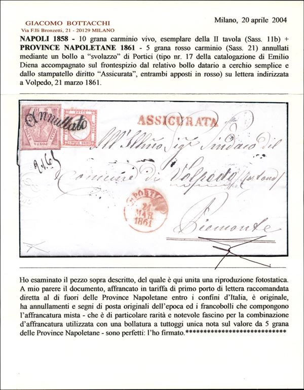 Assicurata affrancata con 10 grana carminio vivo II tavola di Napoli (11b) + 5 grana rosso carminio delle Province Napoletane (21) da Napoli a Volpedo del 21.3.61 annullati con "svolazzo" di Portici - rara combinazione di affrancatura e annullo su 5 grana unico caso conosciuto - splendida - cert. Bottacchi