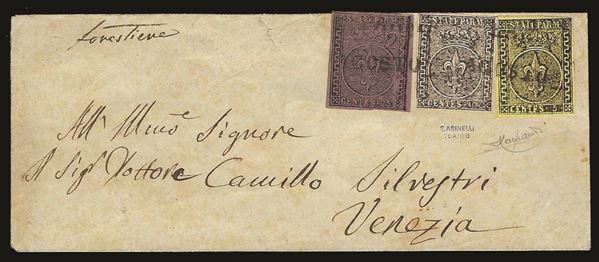 Bustina in affrancatura tricolore con 5 cent giallo + 10 cent bianco + 25 cent violetto (1 + 2 + 4) da Parma 27 agosto per Venezia - minimi difetti ma insieme molto gradevole - Raybaudi + Asinelli
