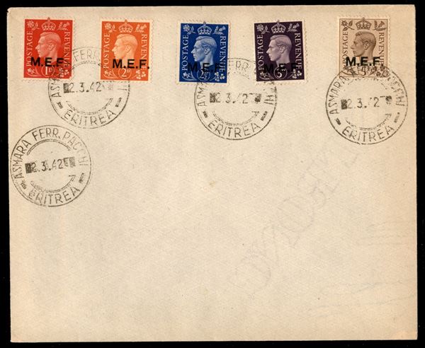 CAIRO + NAIROBI - Soprastampati (1/5) - serie completa - tiratura mista - usati su busta nel giorno d’emissione - Asmara 2.3.1942