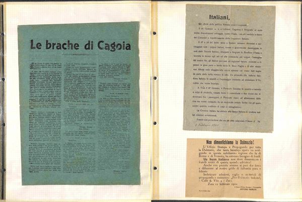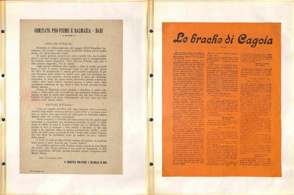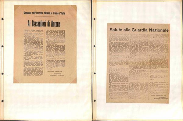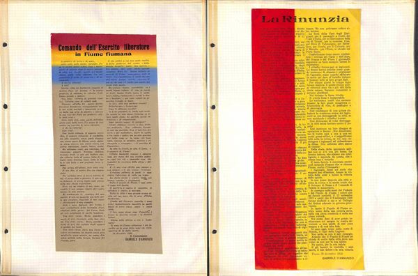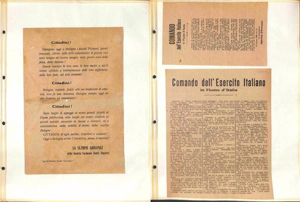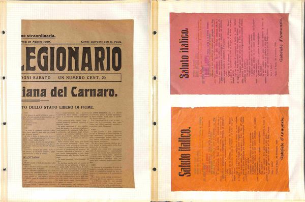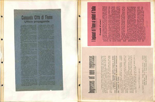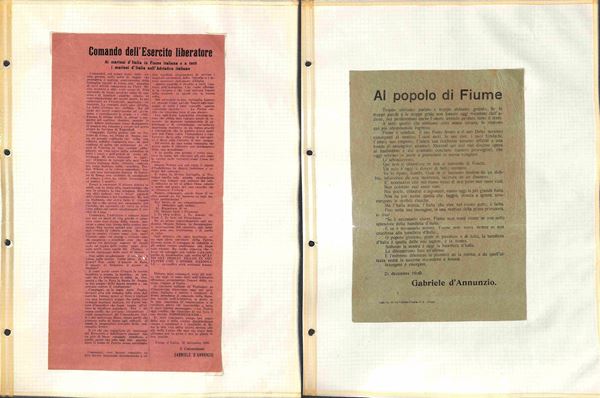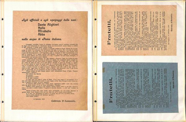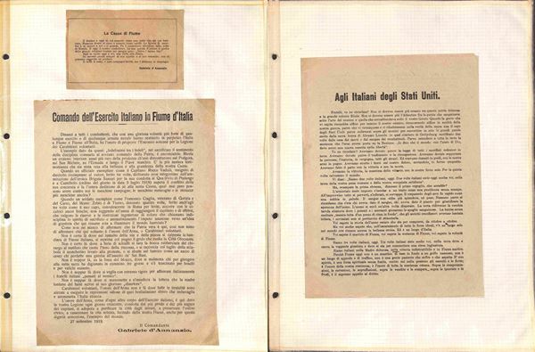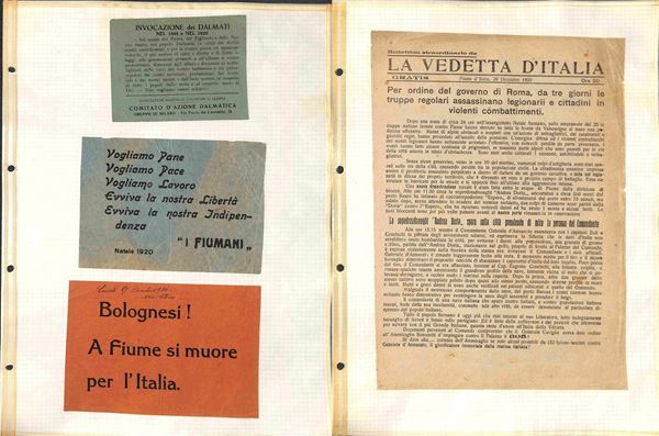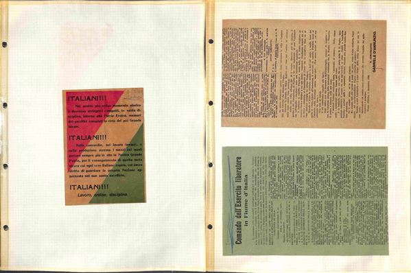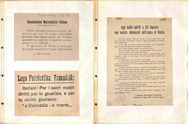 D'ANNUNZIO/FIUME - 1919/1922 - Splendida collezione di 295 volantini del periodo in 4 grandi album - insieme con molte presenze di notevole interesse con volantini anche ripetuti in colorazioni differenti un manifesto (CHI FIUME FERISCE…) e alcuni biglietti e giornali - ottimo stato di conservazione - merita esame