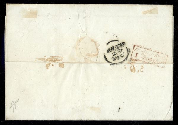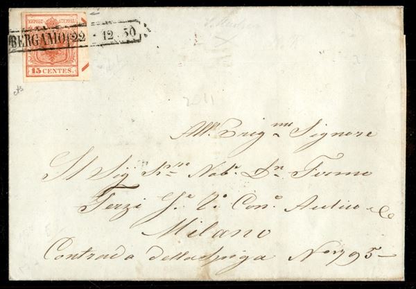 Esemplare con inizio di Croce di S. Andrea a sinistra - 15 cent rosso carta a mano primo tipo prima tiratura su lettera da Bergamo 22.12.50 per Milano (3a R.50 Pti. 5) - insieme molto bello e fresco