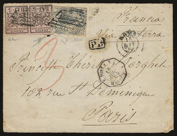 Fronte di lettera con coppia 5 baj rosa + 50 baj azzurro da Roma 14 giu. 64 per Parigi - cert. Sorani