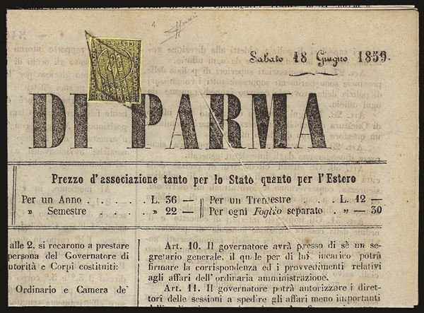 Giornale di Parma con 5 cent giallo arancio (1) del sabato 18 giugno 1859 annullato a losanga - eccezionale uso in periodo di Governo Provvisorio - grande rarità - cert. Sorani