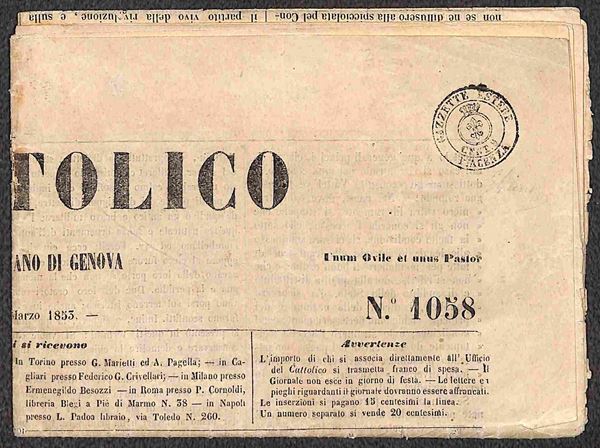 Giornale Il Cattolico di Genova del 10 marzo 1853 con bollo a tampone dell'ufficio postale di Piacenza Gazzette Estere (B2) - Piacenza cent 9 - Diena