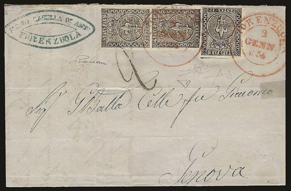 Lettera affrancata con 10 cent bianco + coppia verticale 10 cent bianco annullati con d.c. grande in rosso di Fiorenzuola 2 genn. 1854 per Genova - qui tassata 2 decimi (con bollo a tampone che annulla parzialmente un francobollo - Fiecchi - Raybaudi - Vaccari - cert. E.Diena