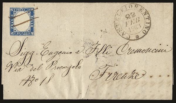 Lettera affrancata con 15 cent azzurro (11) da Castelfiorentino 22 feb. 63 per Firenze - francobollo annullato con due tratti a penna - ex coll. Provera