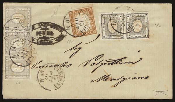Lettera con 10 cent + coppia e striscia di tre del 1 cent grigio (14E + 19 + 19e) da Perugia 15 ott. 63 per Mongiano