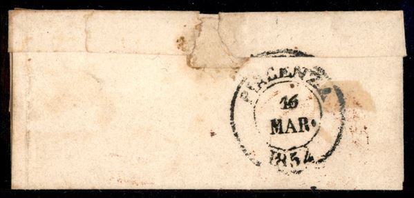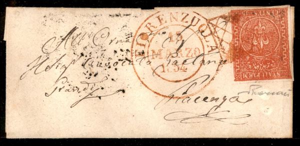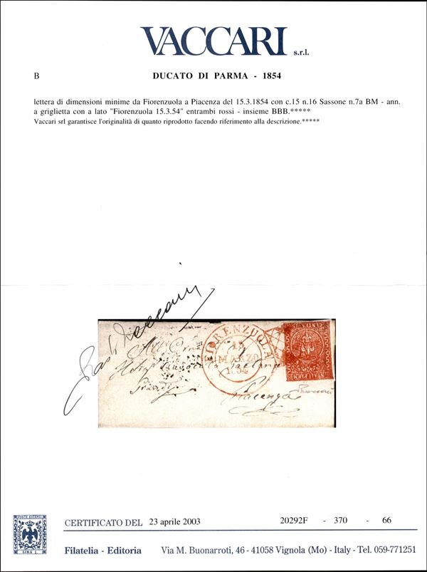 Lettera con 15 cent vermiglio (7a) annullato con griglietta rossa + d.c. Fiorenzuola 15 mar. 1854 in rosso per Piacenza - rara di grande effetto cromatico - cert. P. Vaccari