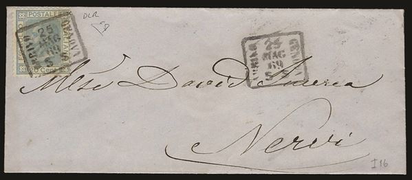 Lettera con 20 cent celeste (26) annullato con bollo in cartella Genova Arrivo 25 mag. 69 - molto raro