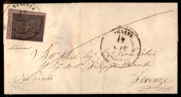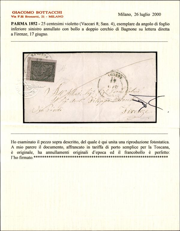 Lettera con 25 cent violetto (4) angolo di foglio con annullo d.c. Bagnone 17 giu. 185... per Firenze (P.ti 11) - cert. Bottacchi e Vaccari