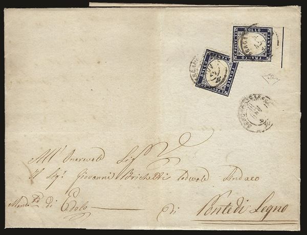 Lettera con due esemplari 20 cent indaco (2) uno bordo di foglio inferiore con coda completa da Bergamo Bassa 10 nov. 62 per Ponte di Legno - cert. E. Diena