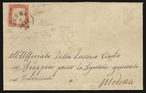 Lettera con Sardegna 40 cent rosso scarlatto da Parma 7 sett. 59 per Modena - grande rarità nel secondo periodo d'uso - firma per esteso Fiecchi Emilio ed Alberto Diena Luigi Gazzi e G. Oliva - cert. E. Diena