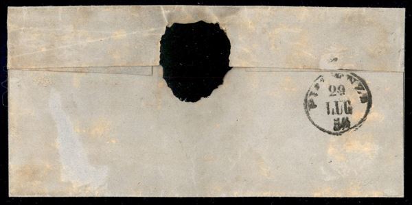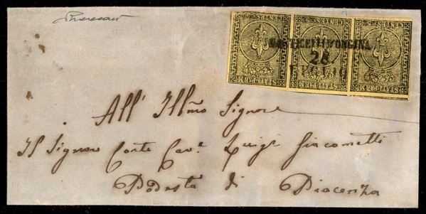 Lettera con striscia di tre del 5 cent giallo arancio (9) con lineare su tre righe Monticelli D'Ongina 28 luglio del 1858 per Piacenza (P.ti 8)