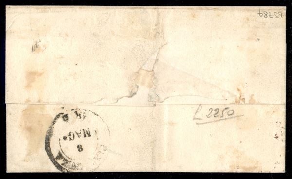 Lettera con striscia di tre del 5 cent giallo arancio (6) con unico annullo centrale in rosso brunastro Fiorenzuola 7 maggio 1855 per Piacenza - rara e di qualità (P.ti 12) - firma per esteso Giulio Bolaffi e A. Diena -
