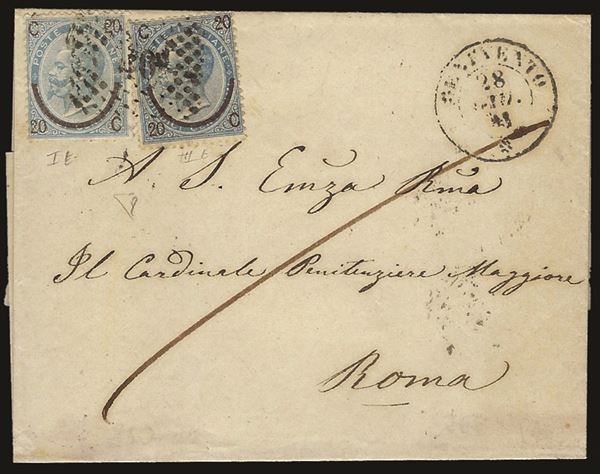 Lettera con valori gemelli ferro di cavallo + III tipo da Benevento 28 giu. 1866 per Roma