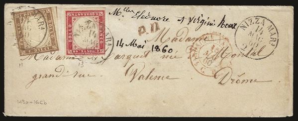 Lettera da Nizza Mar.a 14 mag. 60 per la Francia con 10 cent bruno lillaceo + 40 cent carminio lillaceo (14Ba + 16Cb)