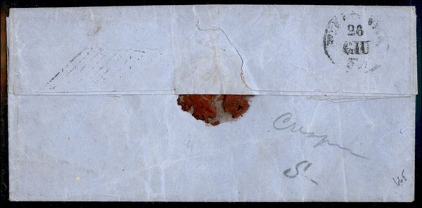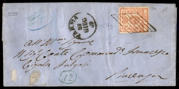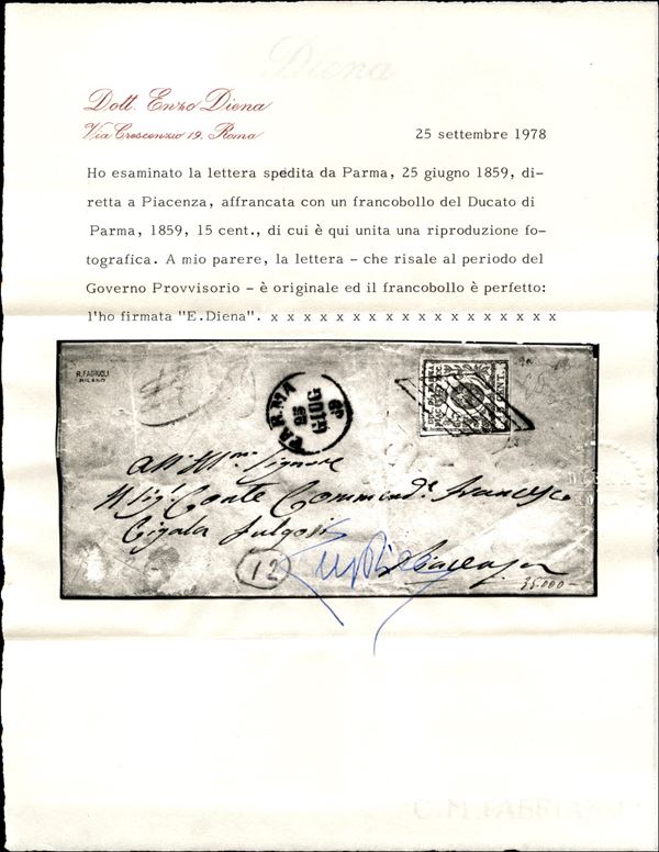 Lettera in periodo di Governo Provvisorio con 15 cent vermiglio (9) annullato a losanga con a lato il cerchio piccolo Parma 25 giug. 59 per Piacenza - cert. E. Diena