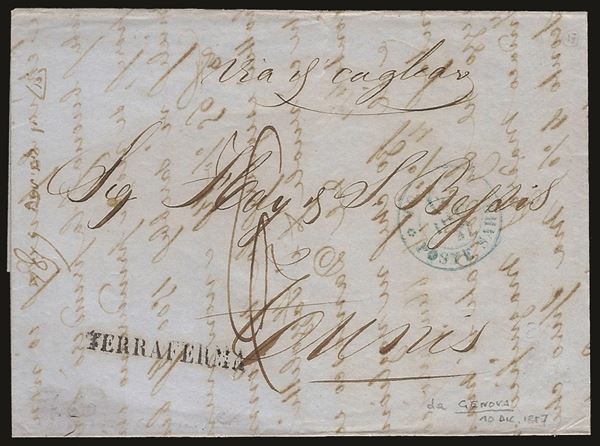 Lettera non affrancata da Genova 10 dic. 1857 con bollo lineare Terraferma e con bollo d.c. azzurro Tunisi Poste Sarde Apposto in Arrivo con Tassa 6 Decimi