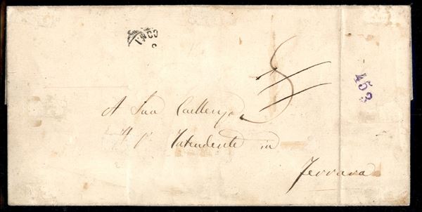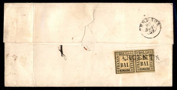 Lettera per Ferrara affrancata al verso con una coppia del 1/2 baj giallo paglia (1) annullata col lineare di Argenta - firma per esteso Em. Diena