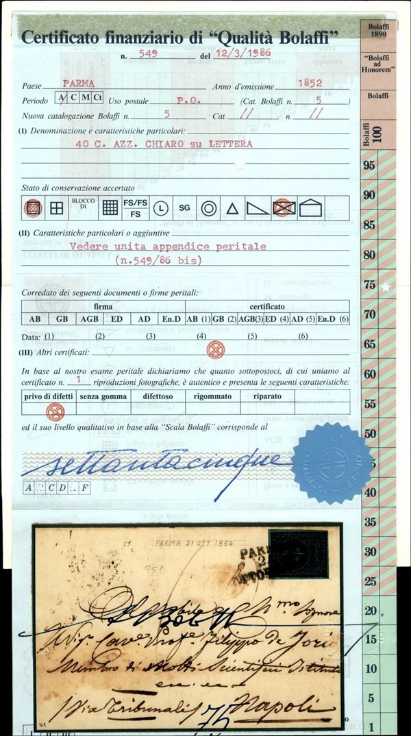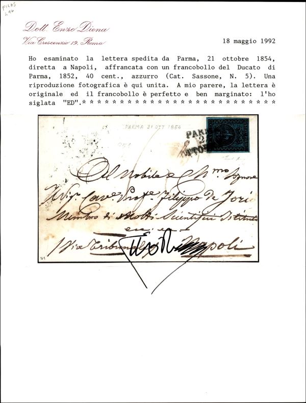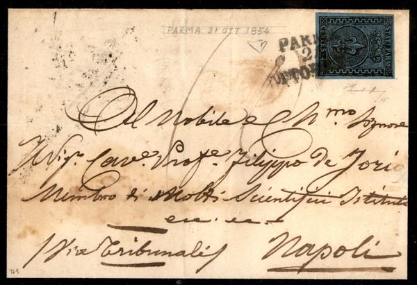 Lettera per il Regno di Napoli in transito per lo Stato Pontifici con 40 cent azzurro (5) da Parma 21 ottobre del 1854 tassata in arrivo per 10 grana (tassa per 1 foglio) - cert. E. Diena + cert. Bolaffi