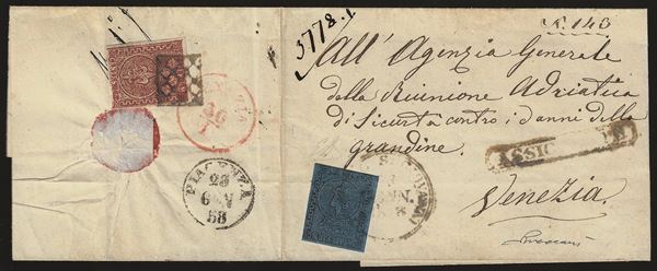 Lettera per Venezia con 40 cent azzurro annullo d.c. Castel S. Giovanni 28 genn. 1858 con a lato il bollo in cartella Assicurato e al verso il 25 cent bruno rosso della seconda emissione con annullo a griglietta per assolvere il diritto di raccomandazione - due sole raccomandate note da questo ufficio postale - cert. dettagliato Vaccari