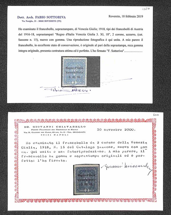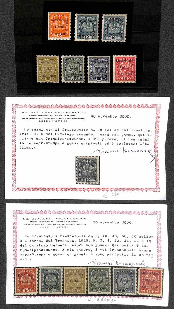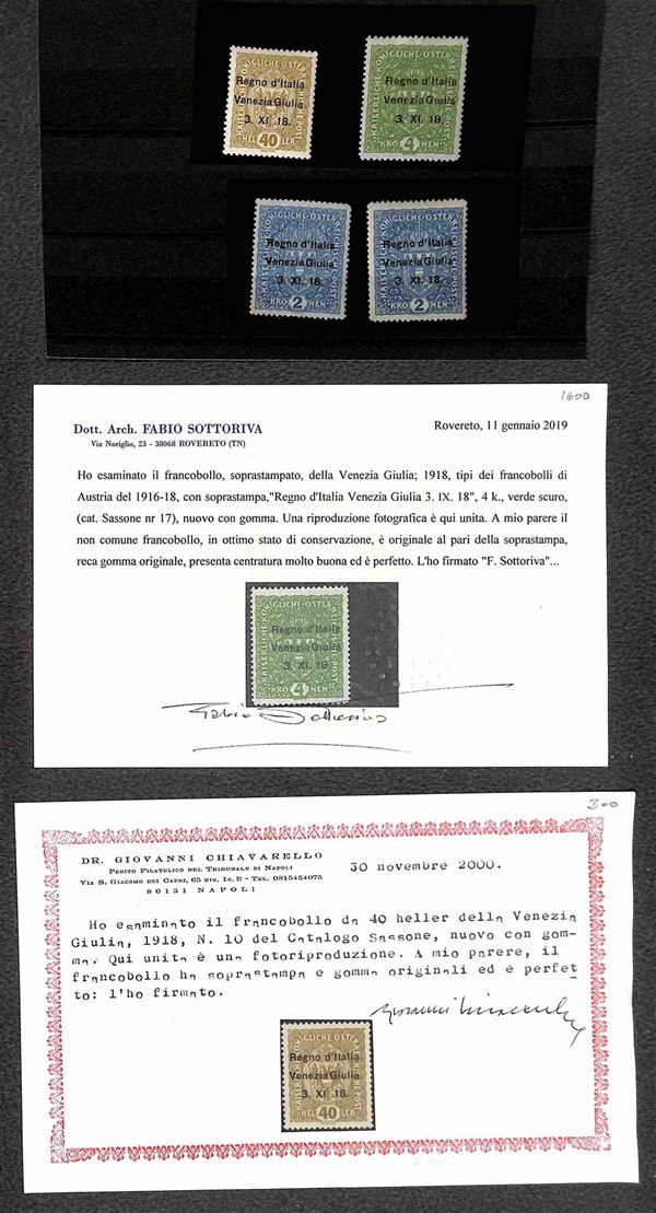 OCCUPAZIONI - Trentino e Venezia Giulia - 1918 - Lotto di 13 esemplari del periodo tutti certificati montati su 3 cartoncini - valore di catalogo oltre 7500 € - merita esame