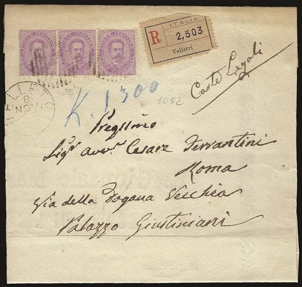 Raccomandata con striscia di tre 50 cent violetto (42) da Velletri 8 nov. 87 per Roma - ex coll. Provera
