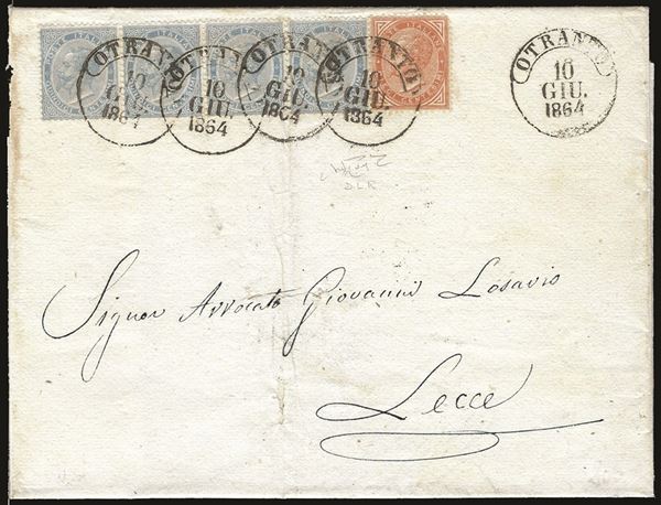 Rara lettera affrancata con 10 cent ocra arancio + striscia di quattro 15 cent celeste (L17 + L18) da Otranto 10 giu. 1864 per Lecce - cert. Raybaudi