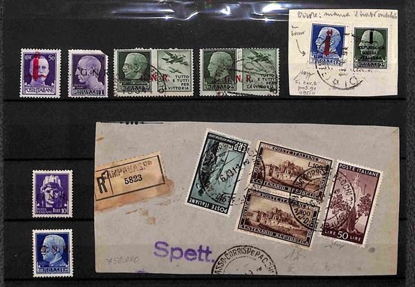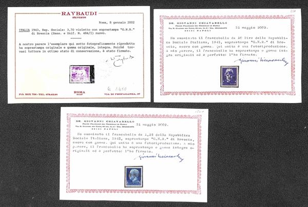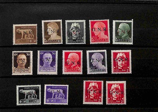 REPUBBLICA SOCIALE - 1943/1944 - Interessante insieme di valori nuovi e usati del periodo montati su due cartoncini - alcuni certificati - valore di catalogo oltre 4000 € - merita esame