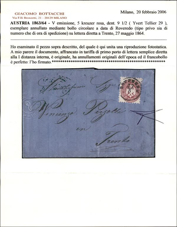 Roveredo (solo datario - P.ti 12) - su 5 kreuzer (32 - Austria) lettera per Trento del 27.5.64 - cert. Bottacchi