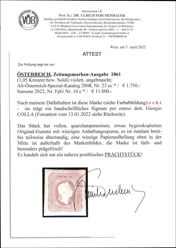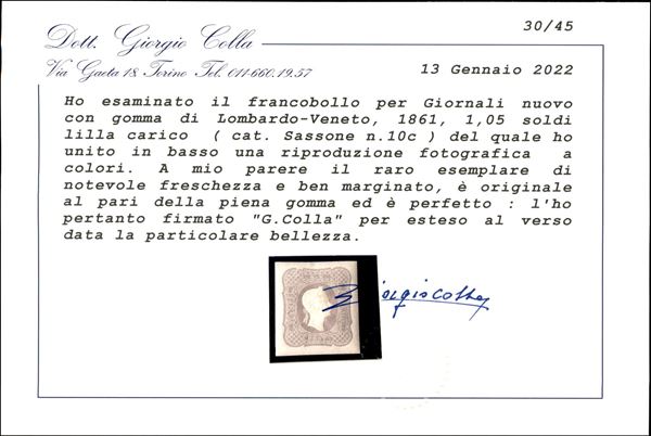 Splendido esemplare del francobollo per giornali 1,05 soldi lilla carico (10c) molto fresco e con ampi margini - gomma originale - cert. Colla + cert. Ferchenbauer