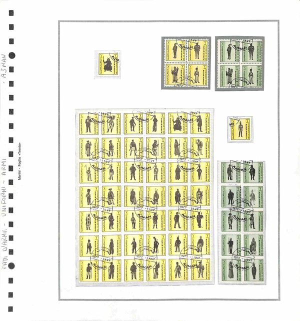 TEMATICA - EVENTI STORICI GUERRE ARMI UNIFORMI - 1920/1980 circa - Collezione di valori serie complete ed alcuni oggetti postali del periodo di diversi paesi mondiali montati in due cartelle con fogli artigianali - nuovi e usati - bell'insieme