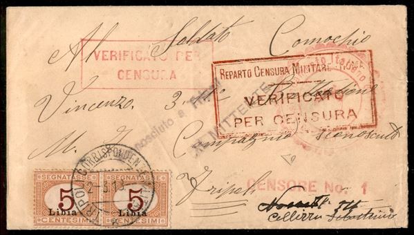 Tripoli Corrispondenze Militari - 5 cent (1A - cifra rosso bruno) - coppia orizzontale - Comando Distaccamento Italiano di Palestina - busta tassata in arrivo - 2.3.1918 - En. Diena