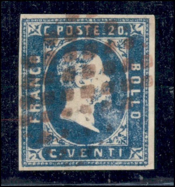 1851 - Splendido esemplare del 20 cent azzurro (2) - quattro margini bianchi e annullo a rombi in colore rosso - firma AD