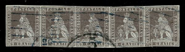 1851 - Striscia orizzontale di cinque del 9 crazie viola bruno su grigio (8 cat.15000) - usata con buoni margini - cert. Raybaudi + Enzo Diena