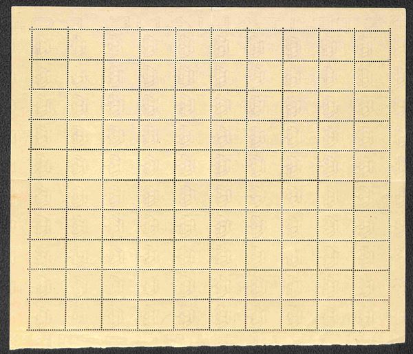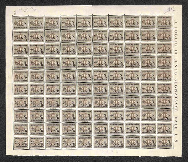 1944 - 5 cent Segnatasse (47/I varietà ca)- intero foglio di 100 con soprastampa obliqua e numero di tavola (254) - gomma integra - unico - firme Sorani + M. Raybaudi