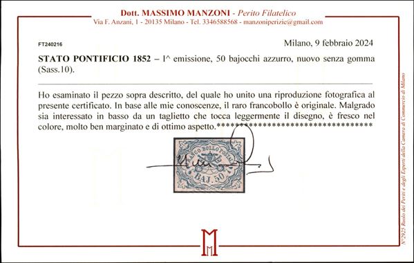 50 baj nuovo senza gomma (Sass. 10). Raro cert. Manzoni