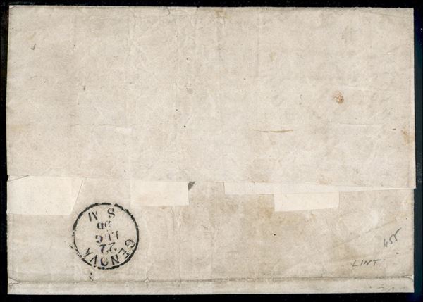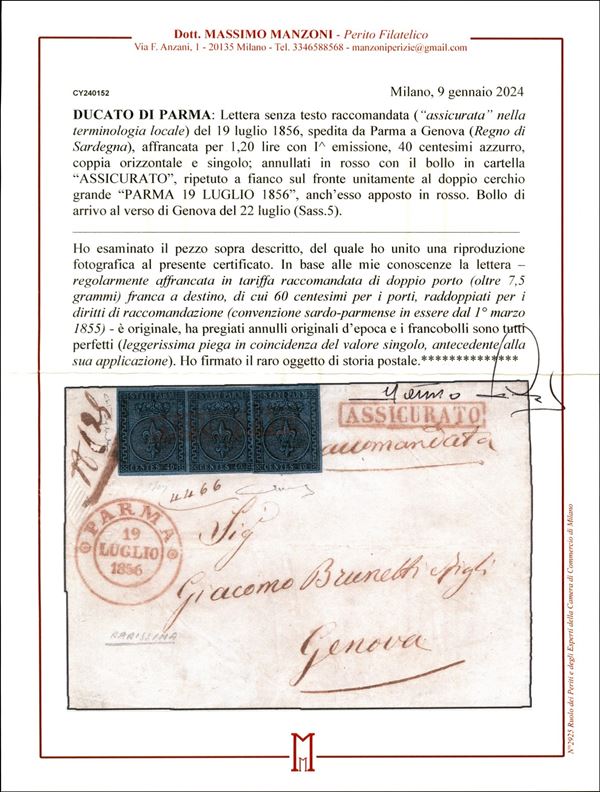 Assicurata da Parma a Genova 19 luglio 1856 affrancata per 120 cent. con una coppia del 40 cent. I em. + singolo annullati con ASSICURATO in rosso (p. 10). Rarissima affrancatura (la striscia di 3 del 40 cent. non è conosciuta (Sass. 5) cert. Manzoni e Raybaudi