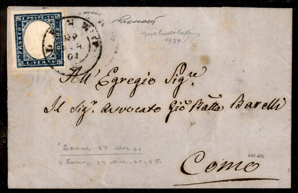 Da Lenno a Como il 27 marzo 1861 con 20 cent. (Sass. Ca) annullato con doppio cerchio (p. 8)