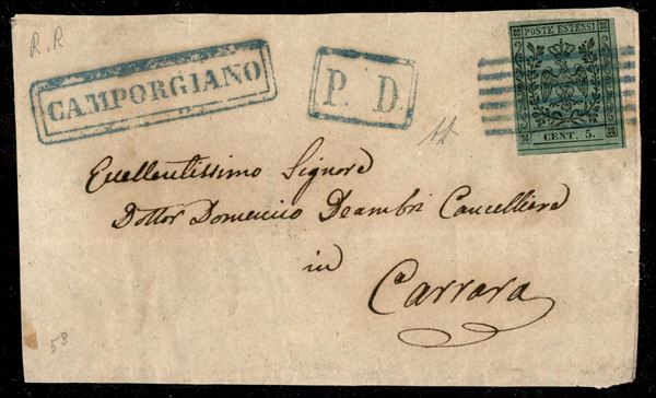 Frontespizio di lettera spedita da Camporgiano a Carrara con 5 cent. verde oliva (Sass. 8) annullato col bollo a 5 sbarre azzurro, Camporgiano in cartella azzurro e PD azzurro (non classificato). Raro insieme. Cert. A. Diena del 1966