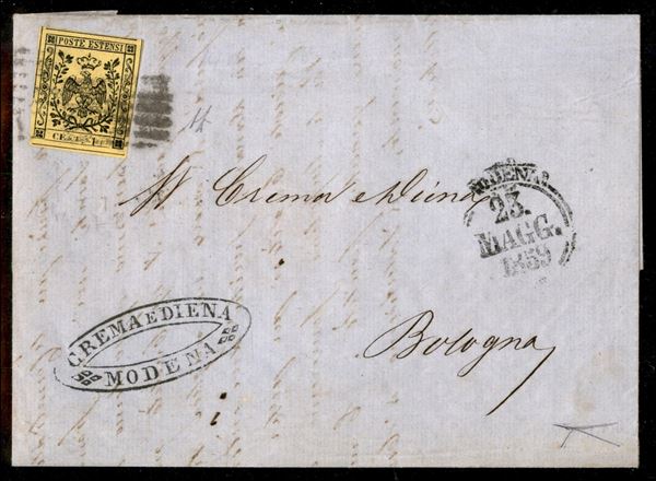 Lettera da Modena a Bologna in Governo Provvisorio 23 maggio 1859 con 15 cent. giallo con lett. N e cifra 5 debolmente impresse (Sass. 3 - cfr. pag. 135) - Rarità cert. Bottacchi