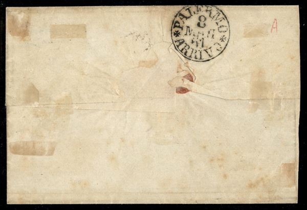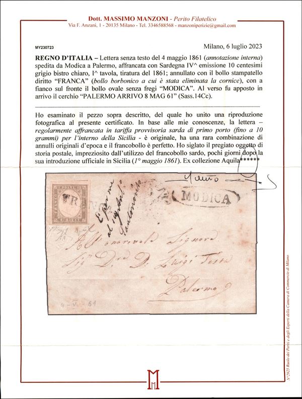 Lettera da Modica a Palermo 4 maggio 1861 affrancata con 10 cent. grigio bistro chiaro I tav. (Sass. 14Cc) annullato con bollo stampatello diritto FRANCA (p. 12) rara cert. Manzoni