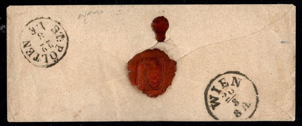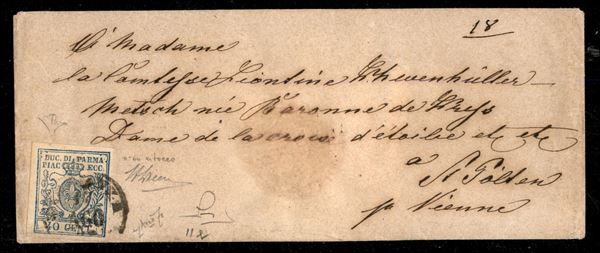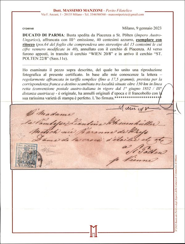 Lettera da Piacenza a St. Polten (Austro Ungarico) il 17 agosto 1858 affrancata con 40 cent. III emissione con ritocco della cifra (Sass. 11e) Grande rarità - cert. Manzoni
