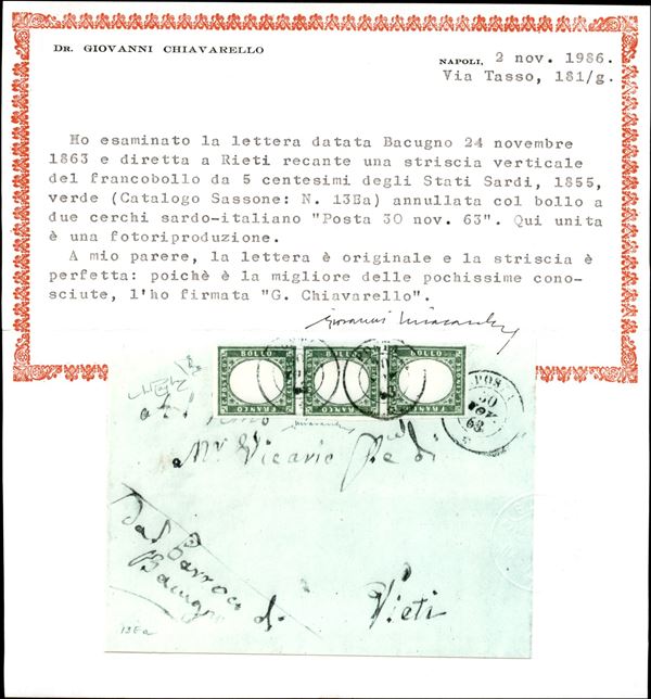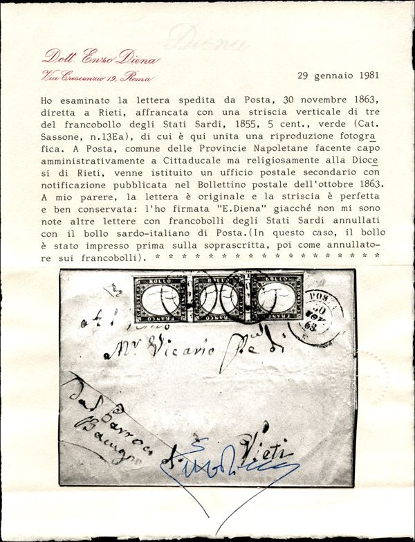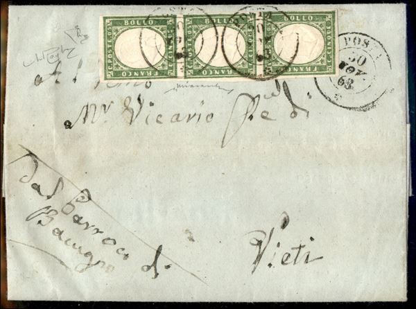 Lettera da POSTA (AQ) il 30 novembre 1863 per Rieti con 5 cent. verde in striscia di 3. Annullo molto raro - Secondo il certificato Diena Unico Noto (Sass. 13Ea + p. R1)
