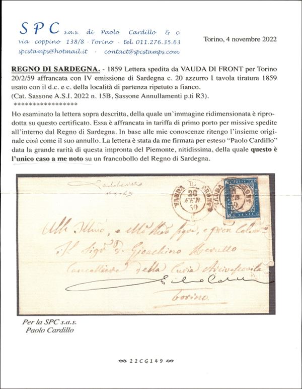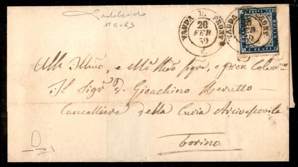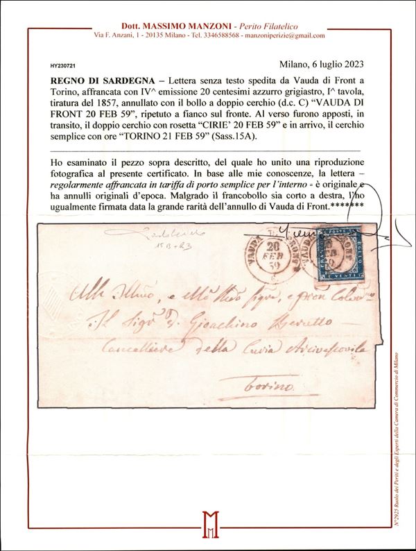 Lettera da VAUDA DI FRONT (Sass. R3) a Torino 20 febbraio 1859 con 20 cent. azzurro grigiastro (Sass. 15A) bene marginato cert. Manzoni
